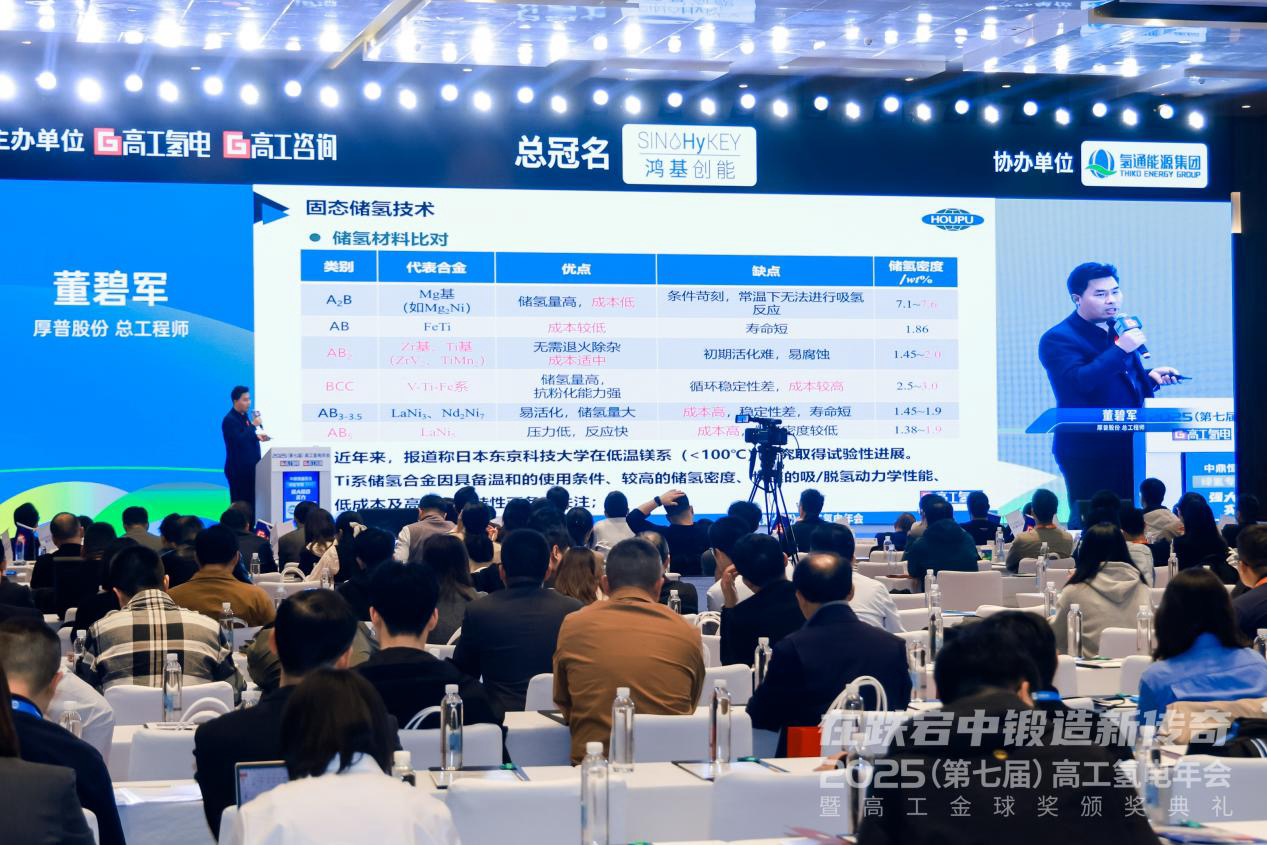 会上,厚普股份总工程师董碧军作“氢能制储运加全链‘赋能’”主旨演讲,他深入剖析固态、气态、液态储氢技术的优劣与固态储氢合金市场趋势,并介绍了厚普固态储氢产品在储能、发电、交通等场景的应用。他还分享了公司在制、储、加、用氢全链条的先进技术与核心产品。在专场圆桌论坛中,董总与行业专家围绕“装备机遇与挑战”“储氢技术发展趋势”等议题进行了深入交流。