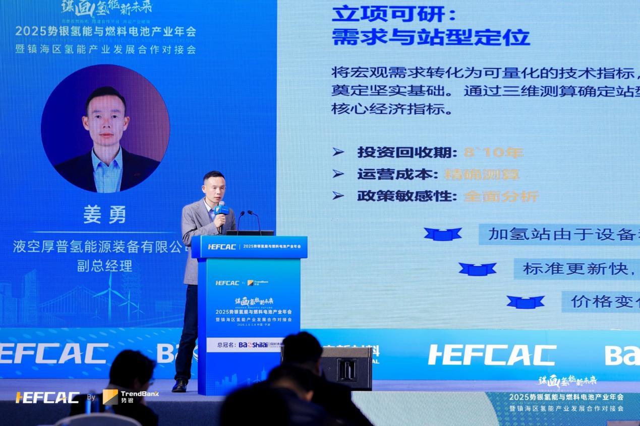 在同期举办的产业论坛上,液空厚普副总经理姜勇邀发表《氢能基建现状与创新EPC解决方案》主题演讲,他系统分析了当前加氢站建设与运营中的核心挑战,并分享了厚普股份及液空厚普在加氢站“立项设计-装备制造-工程建设-智慧运维”一体化EPC解决方案上的创新成果,为制加氢站等氢能基础设施高效建设提供了创新路径。